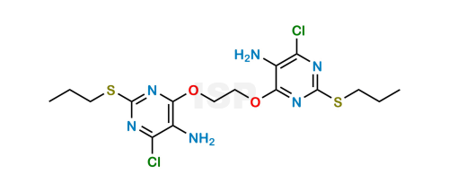 Chemical Name: 6,6′-(ethane-1,2-diylbis(oxy))bis(4-chloro-2-(propylthio)pyrimidin-5-amine) Shipping Temperature: Ambient HSN Code: 38229010Country of Origin: IndiaSmiles: CCCSC1=NC(OCCOC2=NC(SCCC)=NC(Cl)=C2N)=C(N)C(Cl)=N1